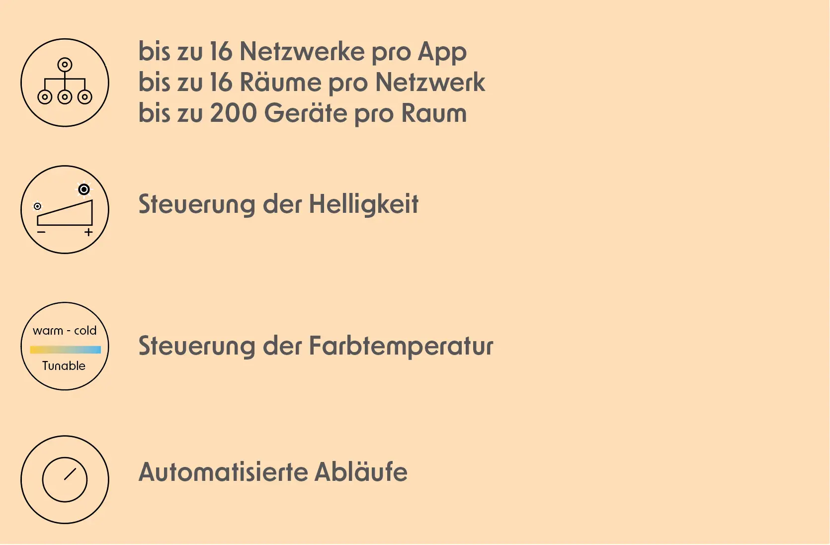Ein-/Aus- und Bluetooth- Lösungen für diverse Beleuchtungsarten von Down-Lights, Tracklight bis hin zur Ambientebeleuchtung. Unser System kann schnell und einfach mit verschiedenen Geräten gekoppelt werden für die Steuerung stehen Ihnen Wandschalter, Funkfern-Bedienungen oder eine Smartphone-App zur Verfügung.Durch einen einfachen und geringen Installationaufwand ist unser System auch für den gewerblichen Einsatz optimal geeignet.